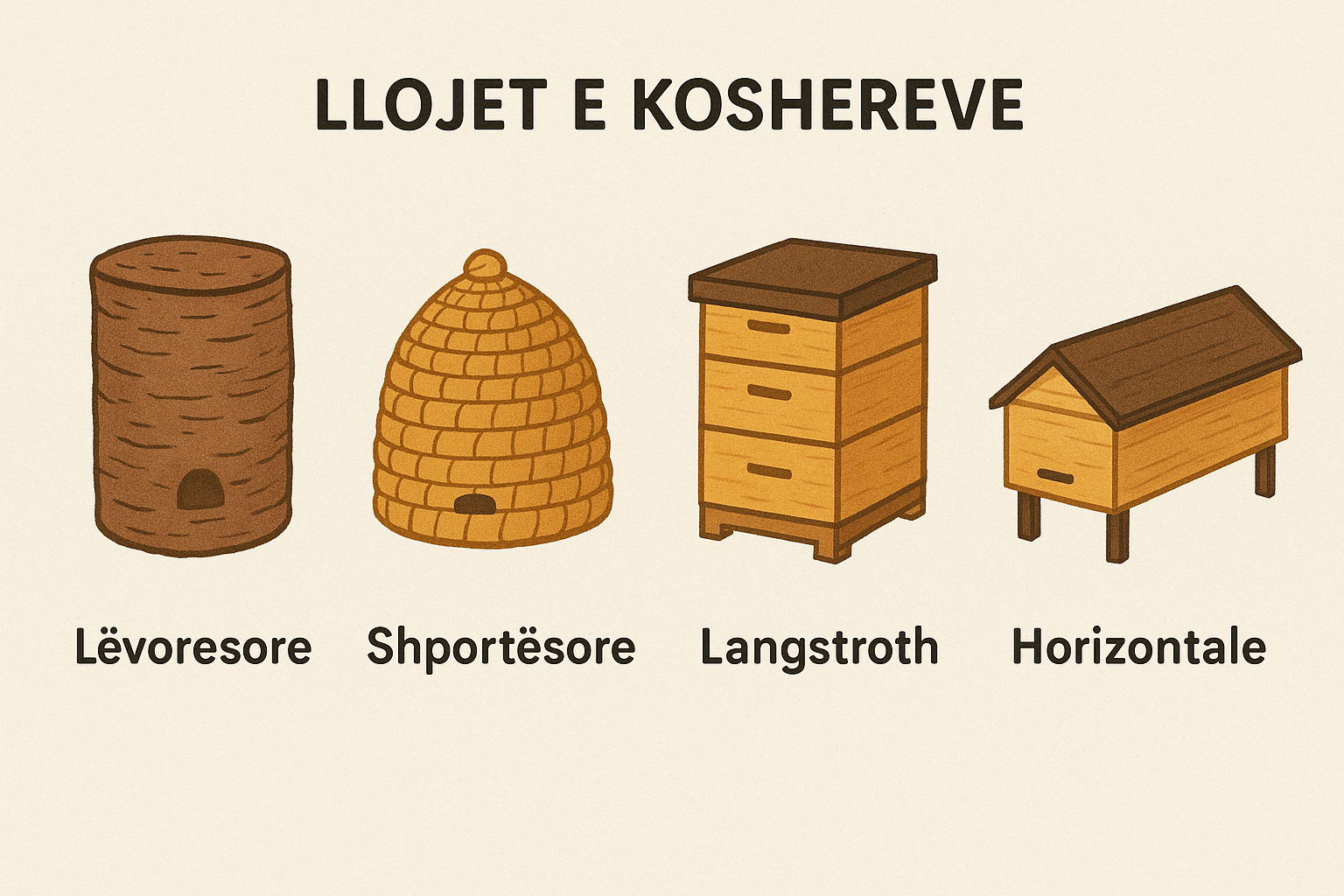 Një nga vendimet më të rëndësishme që një bletar i ri duhet të marrë është çfarë lloj kosheri të përdorë. Zgjedhja e duhur ndikon në lehtësinë e punës, sasinë e prodhimit të mjaltit dhe shëndetin e bletëve. Në këtë mësim, do të shpjegojmë llojet më të njohura të kosherëve dhe si ta zgjedhësh atë që të përshtatet më së miri.